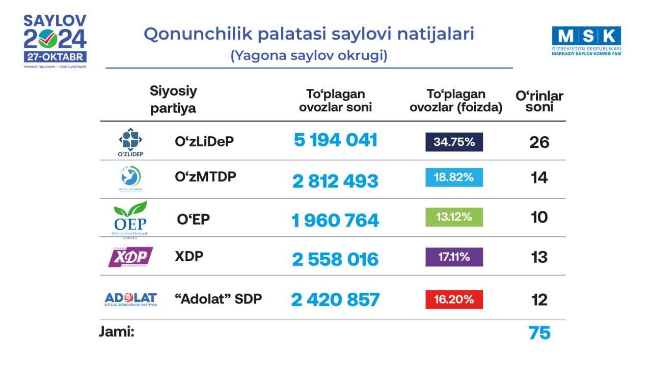 اۉزبېکستان سیلاولر مرکزی کمیسیون نینگ باشلیغی ذین‌الدین نظام‌خواجه‌یف تامانیدن اعلام اېتیلگن نتیجە‌گه اساس، حاضرگه قدر لیبرال دیموکرات حزبی ۳۴.۷۵ فایز آواز تۉپلب بیرینچی اۉرین‌ده دیر.