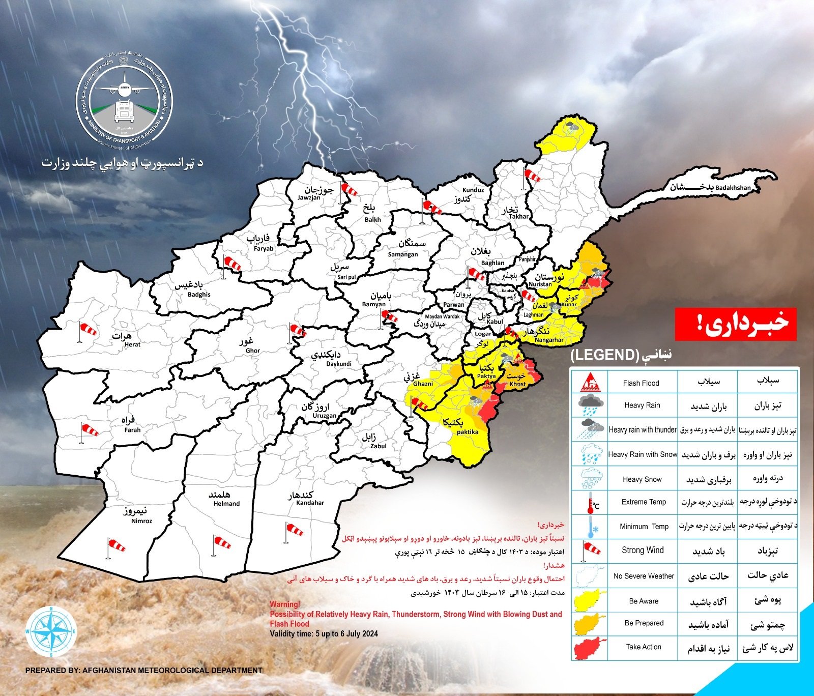 افغانستان هواشناسلیک ادارهسی بیر بیانات ترقهتیب، مملکت بیر نیچه ولایتیده یامغیر یاغیشی و سوو تاشقینی صادر بۉلیشیدن آگاهلنتیردی.